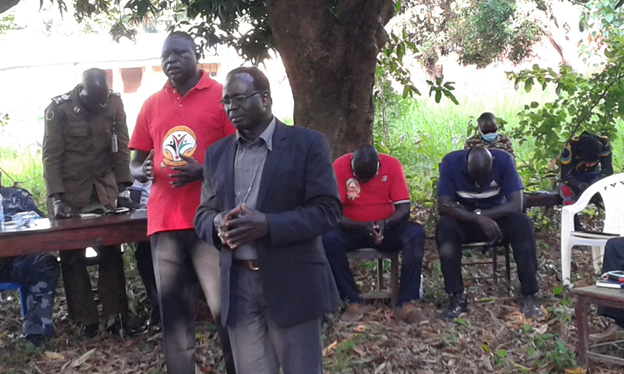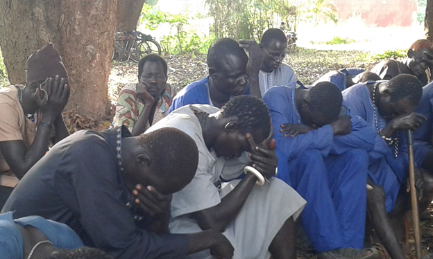 Prayer during Peace discussion with the armed cattle keepers from Bor Jongle State. On the 7/2021 at Kimu Parish KKC.